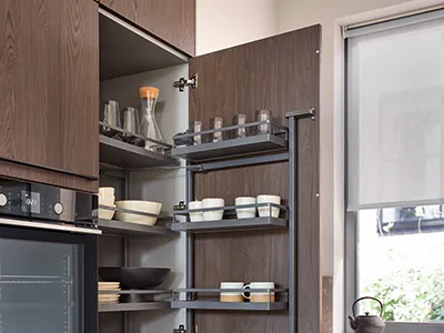 Uttrekkbare skap sørger for at skapene får lettere tilgang og maksimal plassutnyttelse. Når alt har sin plass og har egne løsninger tiltenkt spesifikke ting så får man et mye mer organisert hjem.
